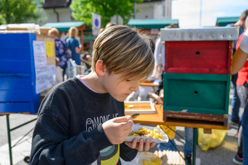 »Čebelarska zveza na takšnih dogodkih z veseljem sodeluje, saj s tem ozaveščamo ljudi o pomenu čebel, ki so ključne za hrano in prehransko varnost,« je z navdušenjem pripovedovala Tina Žerovnik. »Danes tu predstavljamo zaščitene medove iz evropskih shem kakovosti, v Sloveniji so trije,« je pripovedovala, medtem ko je kazala na medene lončke, razstavljene na stojnici. Tako sledljivost kot kakovost tovrstnega medu sta strogo nadzorovana. »Ta med je kakovostnejši, vsebuje manj vode, kar pa je za kupca znak, da se na takšno živilo lahko zanese«, je skrbno opozorila mlada čebelja navdušenka. Ko je na stojnici razkazovala še kolo sreče, je pojasnila, da je slovenski med precej kvaliteten. »Bogata flora in ugodni pogoji za čebelarjenje omogočajo pridelavo različnih vrst medu,« je dodala, kljub temu, da nas zadnja leta ob nepravem času presenetita dež in zmrzal. In kje je torej najbolje kupiti kvaliteten med? »Na tržnici, dogodkih kot je današnji ali pa kar direktno od čebelarja,« je hitela razlagati sogovornica.